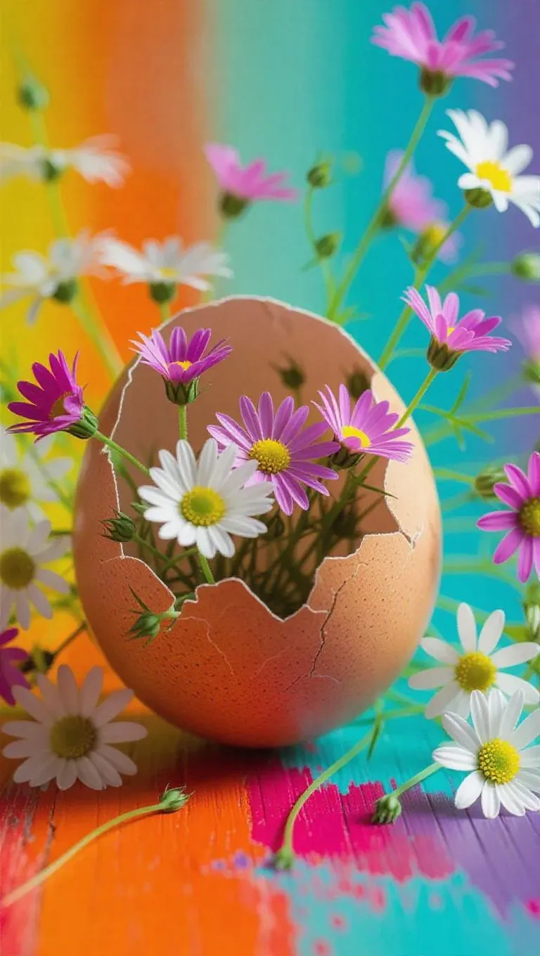A cracked eggshell, not revealing a chick, but a vibrant cluster of wildflowers and fresh green stems, bursting with life and color, set against a colorful, painted background