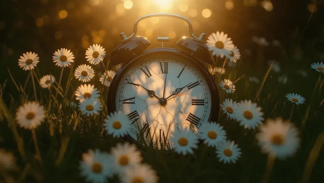 A shattered clock placed within the vibrant wilds, its hands glowing softly, blooming with white daisies, encircled by soft grass and dappled sunlight breaking through the foliage overhead.