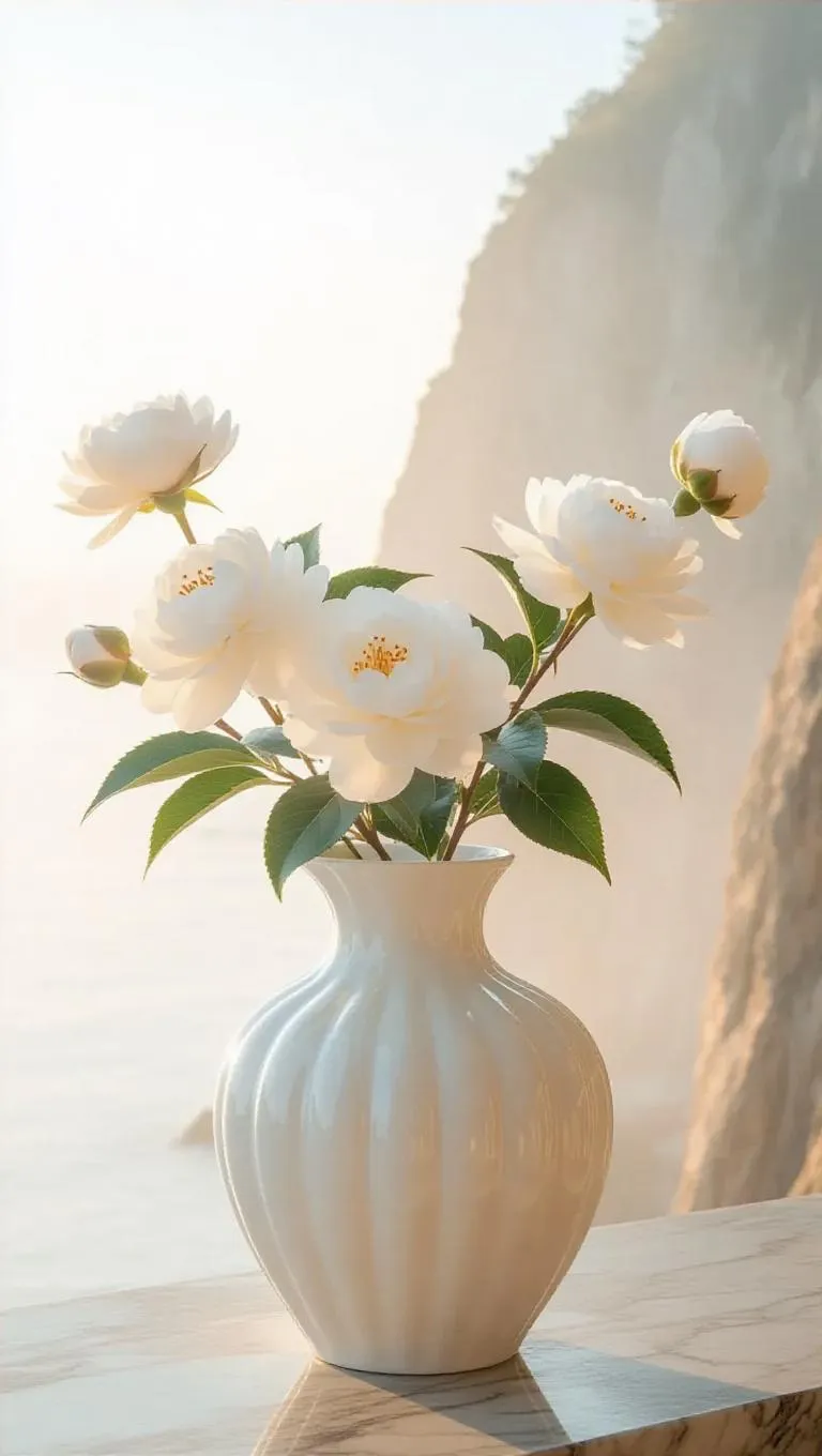 A traditional vase, its profile bold, with ivory camellia petals cascading, time retained in serene dawn, surrounded by a soft, ethereal fog, echoing the beauty of gentle elegance and tranquility in a coastal cliff.