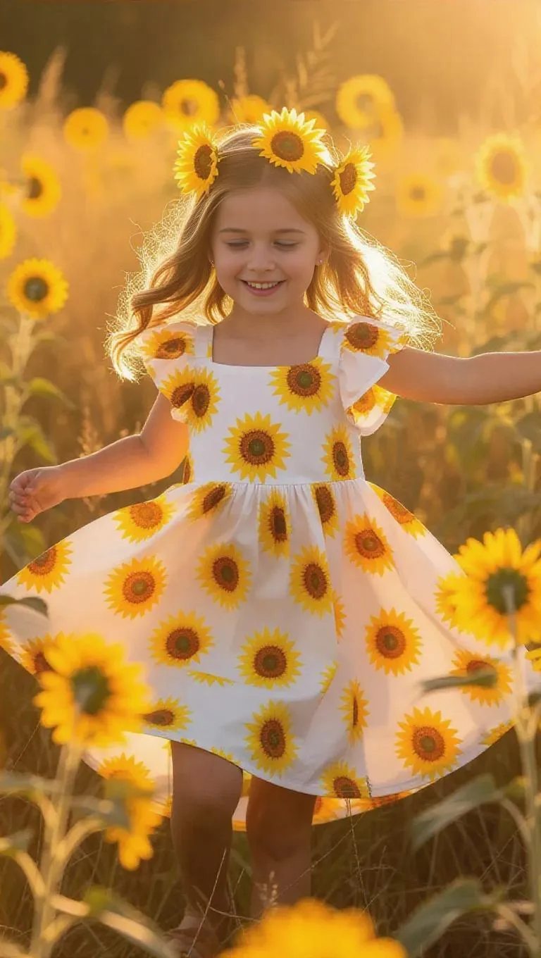 A child wearing a vibrant summer dress with bright sunflowers adorning the hem, dancing in a field of golden grass, the gentle wind swirling around her, adding to the enchanting and peaceful ambiance.