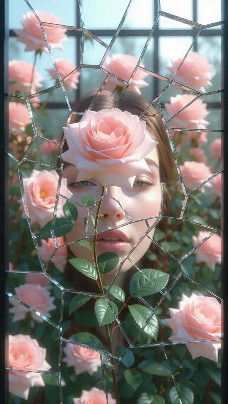 A shattered window reflecting an elegant, blooming rose garden where a face should be, symbolizing inner transformation and growth. The window's fragmented pieces create a mosaic effect, with each shard revealing different angles of the delicate flowers, surrounded by a soft, ethereal glow.