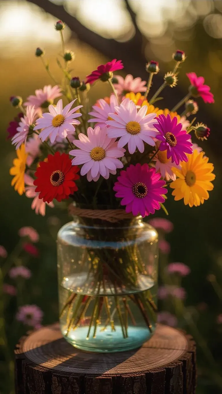 A forgotten vessel, its glass weathered, with bright flower crowns spilling out, time encapsulated in a joyous celebration, wrapped in a warm, nostalgic atmosphere, highlighting the connecting thread of happiness and beauty in a summer festival.