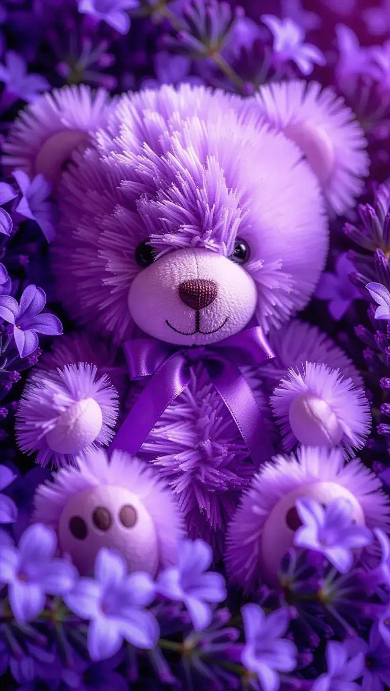 Lavender flowers caress a fully detailed toy bear, creating a whimsical and enchanting scene. Soft petals surround the bear, adding a touch of magic and fairy tale charm.