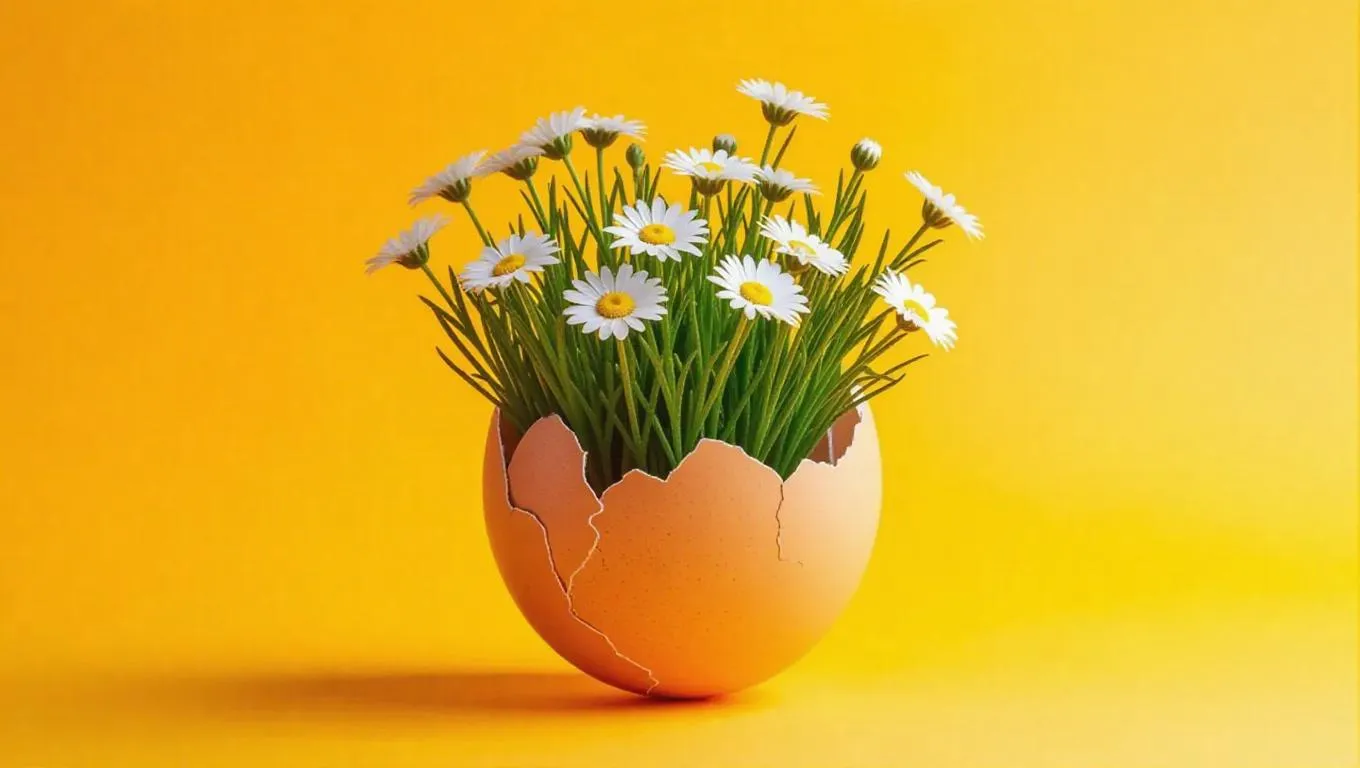 A cracked eggshell, not revealing a chick, but a vibrant cluster of delicate flowers and lush green stems, bursting with life and color, set against a bold, vivid background