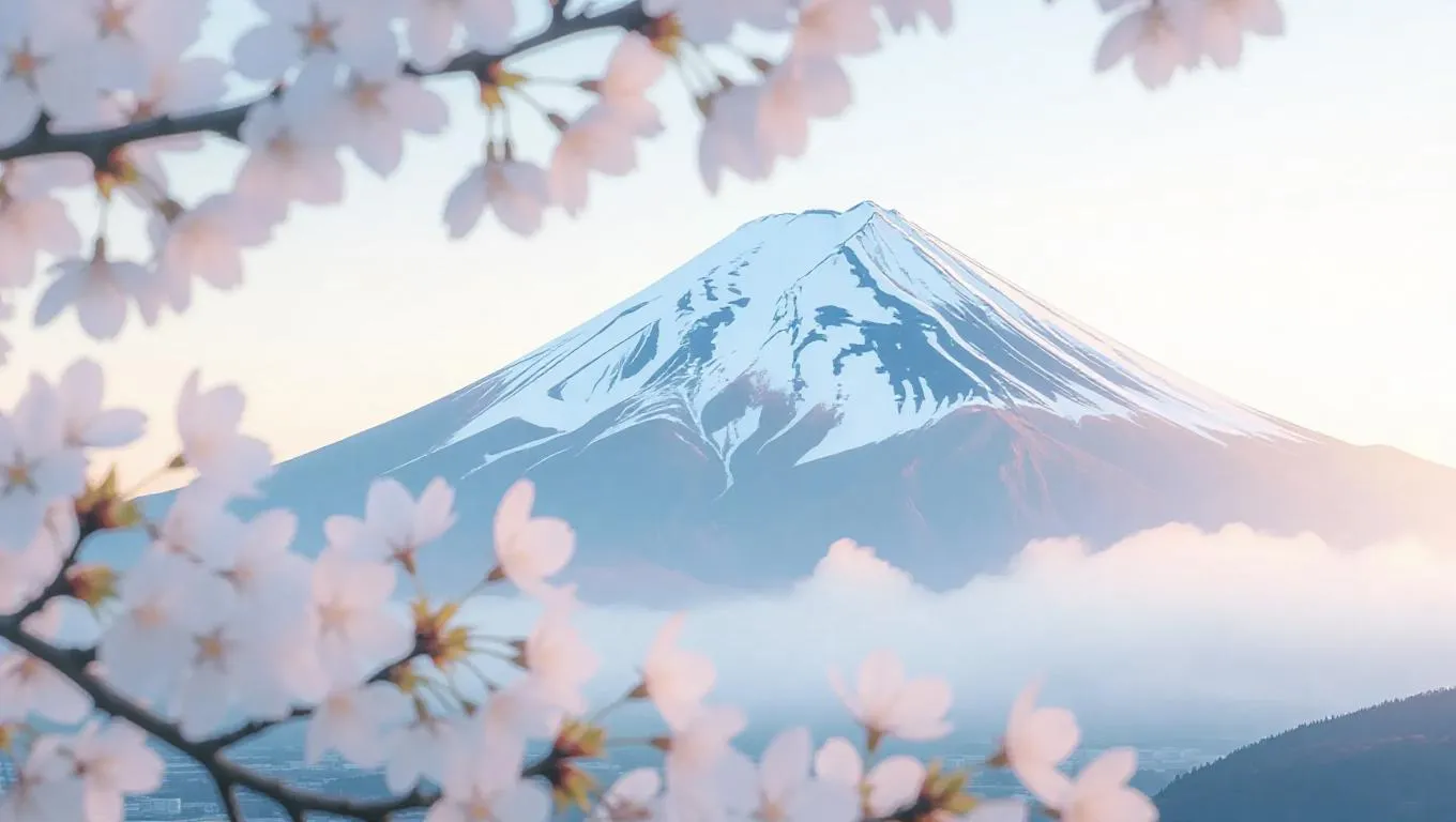 An artistic close-up of Mount Fuji, its snow-capped peak adorned with a delicate lace of silvery white blossoms. The iconic mountain shape remains, but the summit is now an elegant, floral haven. Gentle morning mist wraps around the petals, casting a soft, ethereal glow. The atmosphere is serene and dreamlike, with soft light enhancing the tranquil, symbolic blend of nature and introspection.