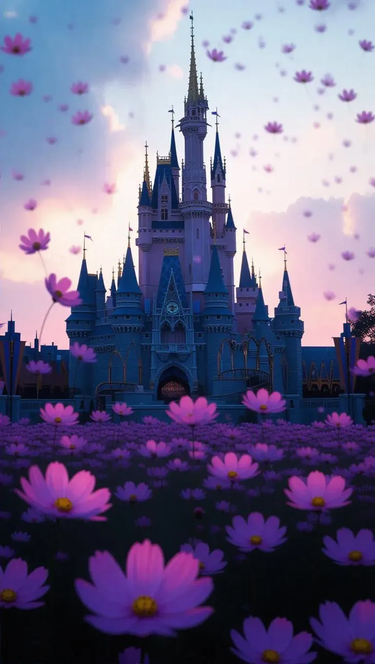 An evocative castle, its glass shattered, with delicate cosmos petals floating out, time frozen in eternal bloom, surrounded by a soft, ethereal glow, capturing the moment of timeless beauty and fragility in a fragrant cosmos garden.