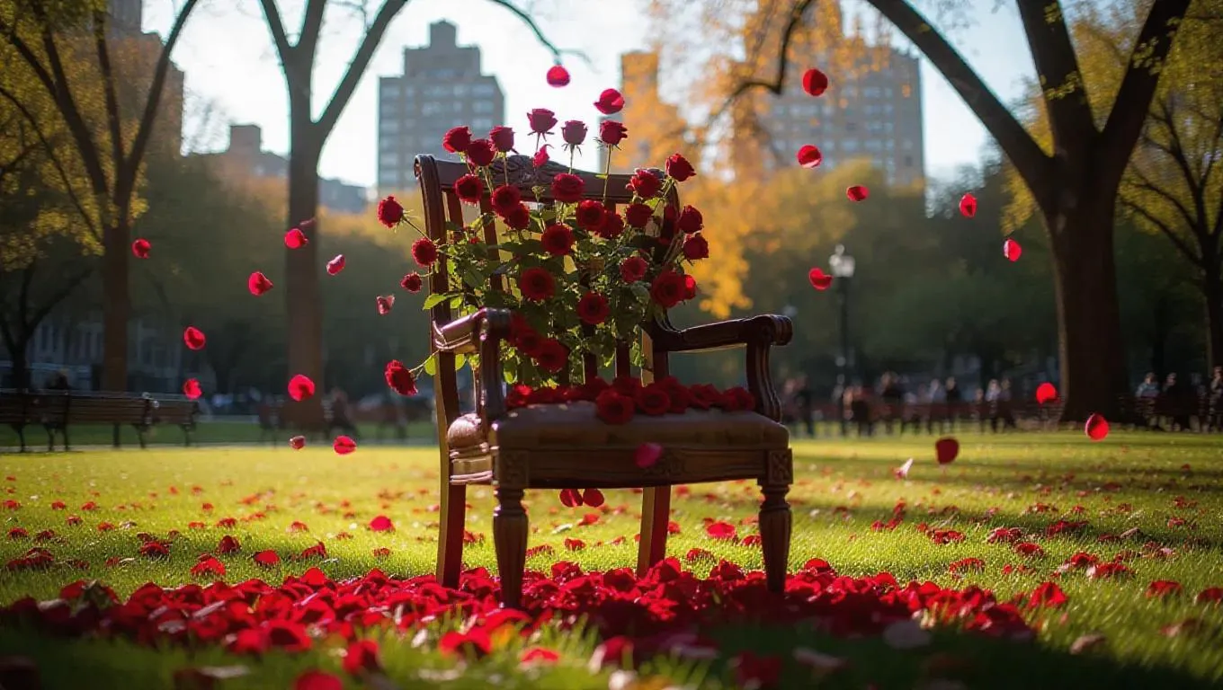 A chair situated in a vibrant urban park, its wooden outline distorted, with many roses sprouting from within, petals fluttering in the breeze, creating a surreal and enchanting scene.