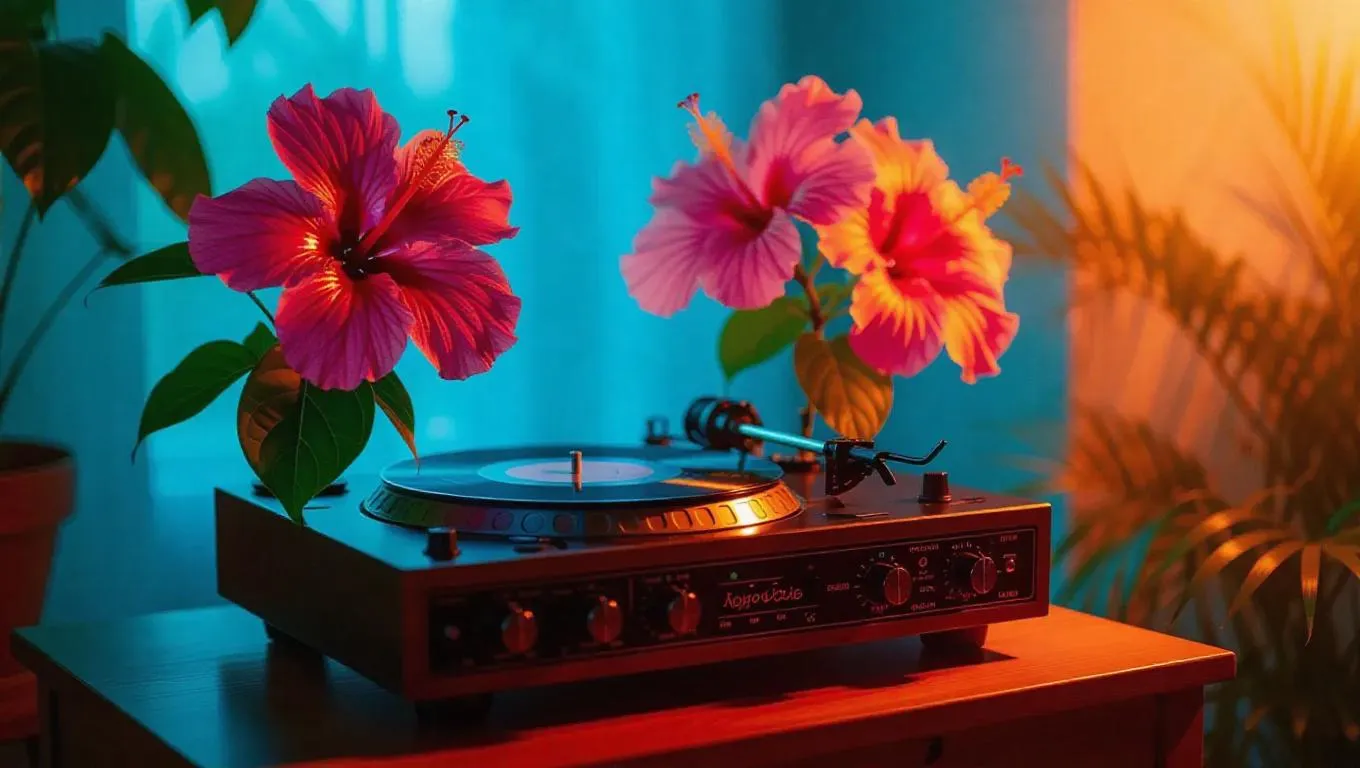 An antique vinyl record player adorned with striking hibiscus flowers sprouting from its speakers, playing lively music in a bright room, casting an energetic, bright glow