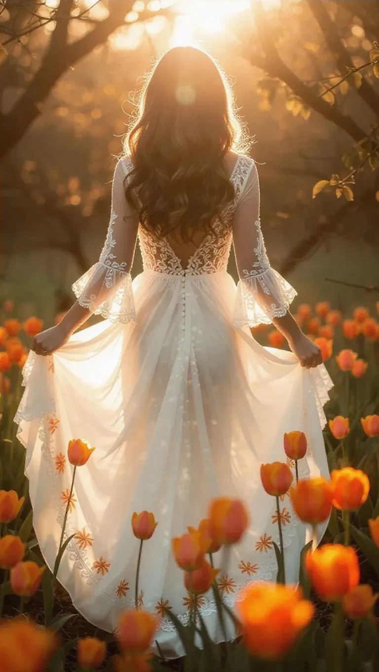 A flowing white dress with delicate orange tulips blossoming along the hem and sleeves, creating a whimsical blend of elegance and natural beauty. The dress sways gently in the breeze, surrounded by soft, radiant sunlight filtering through leaves, enhancing the serene and magical atmosphere.