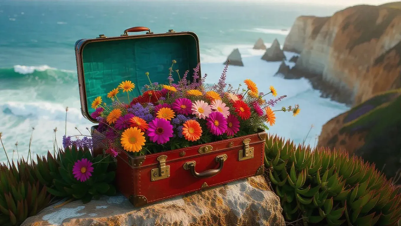 A weathered vintage suitcase, lying on a dramatic cliffside, bursts open with an abundance of vibrant coastal flowers and sprawling vines, creating a breathtaking contrast between old and new, surrounded by crashing waves and expansive skies