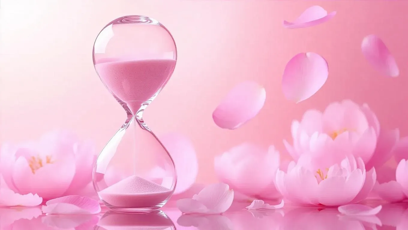 An elaborate hourglass, its glass intricately etched, with delicate peony petals gently floating down, time caught in a gentle embrace, surrounded by a serene, pale pink hue, capturing the moment of transient beauty and peace in a tranquil spa.