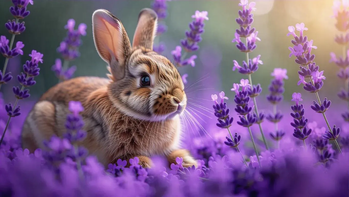 lavender blossoms beautifully grow near a fully detailed plush bunny, creating a whimsical and enchanting scene. Soft petals surround the bunny, adding a touch of magic and fairy tale charm.