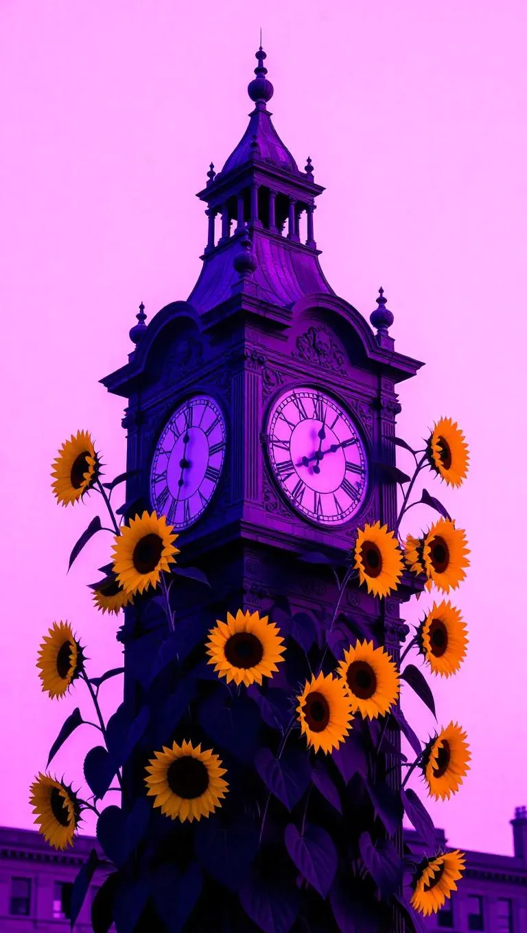 A charming, battered clock tower, shimmeringly radiant with a lavender glow from its weathered face, entwined with bold sunflowers that stretch upwards and bloom from its sides, creating a sunny, uplifting ambiance.