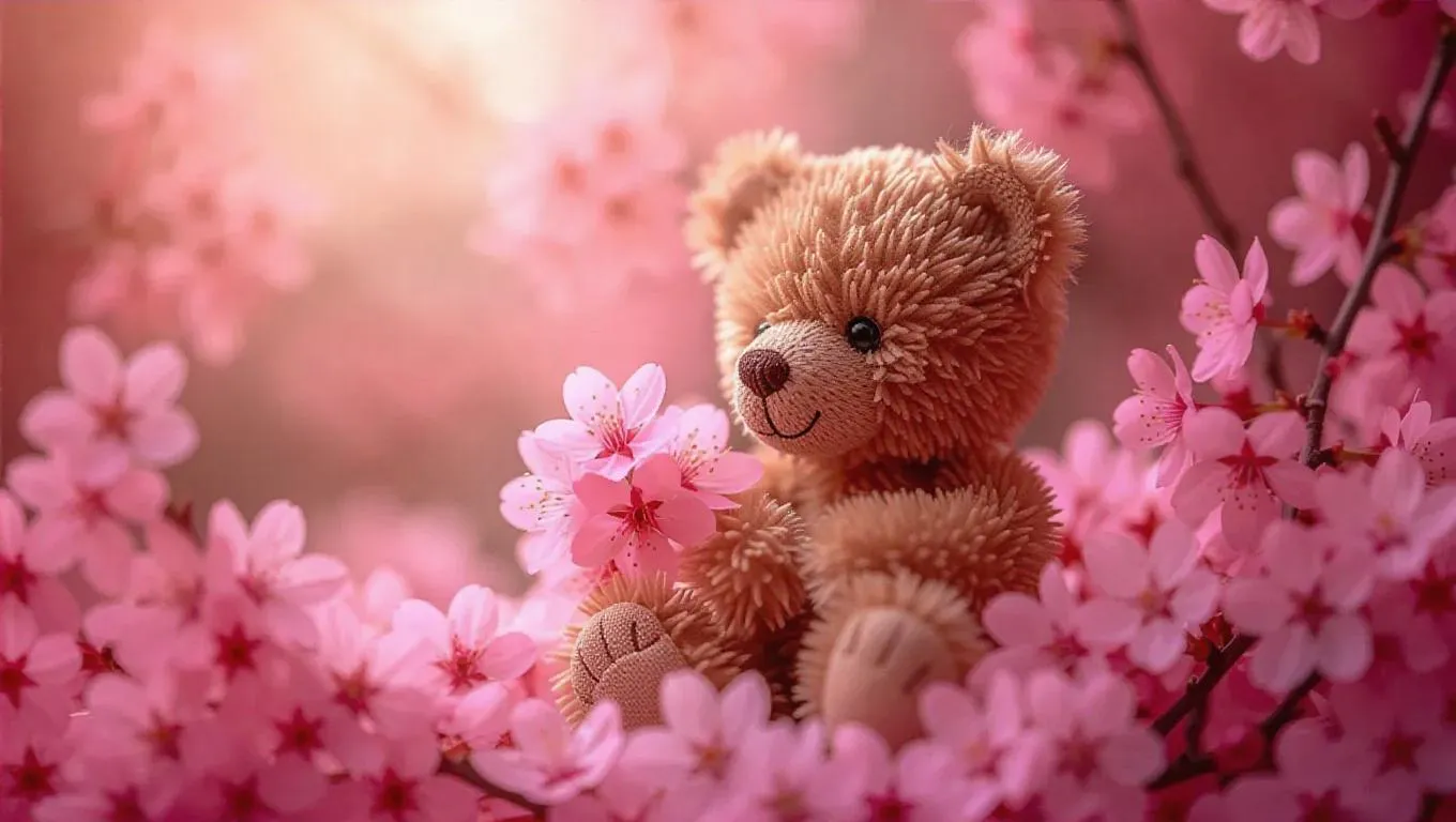 Pink cute blossoms delicately grow around a fully detailed toy bear, creating a whimsical and enchanting scene. Soft petals surround the bear, adding a touch of magic and fairy tale charm