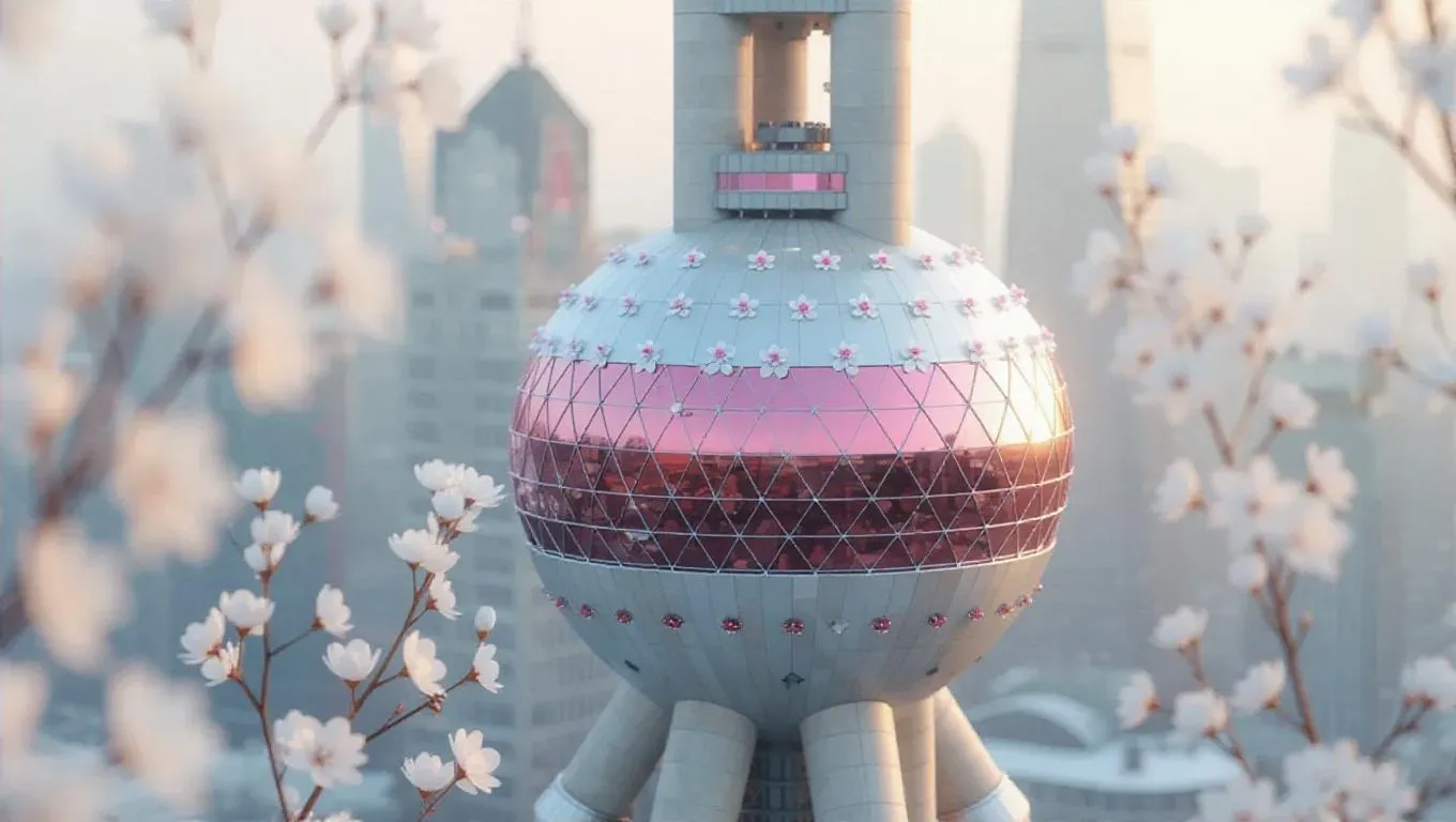 A close-up of the Shanghai Oriental Pearl Tower transformed into a soft, plush, and whimsical version of itself, covered in delicate creamy white blossoms. The iconic spheres and structure of the tower are rendered in a fluffy, tactile texture, giving it a charming and playful appearance. The tiny creamy white flowers bloom abundantly across its surface, creating a romantic and dreamy atmosphere. The background is softly blurred, with hints of a snowy landscape and gentle sunlight enhancing the warmth and serenity of the scene. The overall composition exudes a sense of fantasy and enchantment, blending the modern landmark with the softness of nature. The art style is highly detailed and imaginative, emphasizing the fluffy texture of the tower and the delicate beauty of the flowers.
