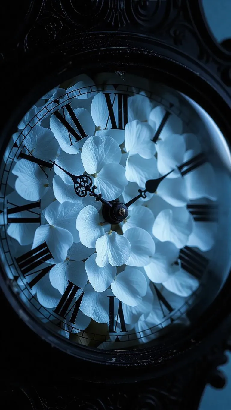An antique clock, its glass foggy, with faded petals swirling inside, time caught in eternal twilight, surrounded by a cool, silver glow, capturing the moment of ephemeral beauty and fragility