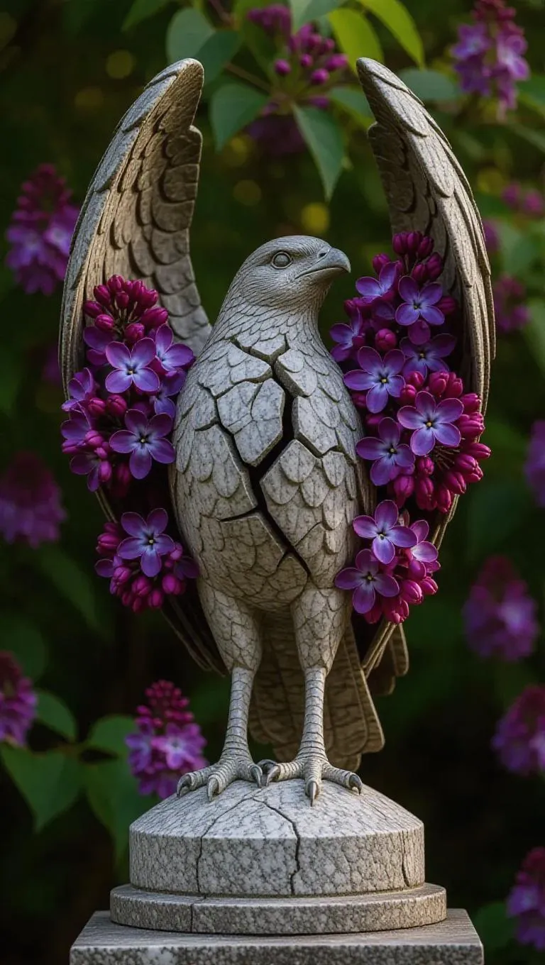 A stone statue of a bird, cracks along its wings opening into clusters of lilacs