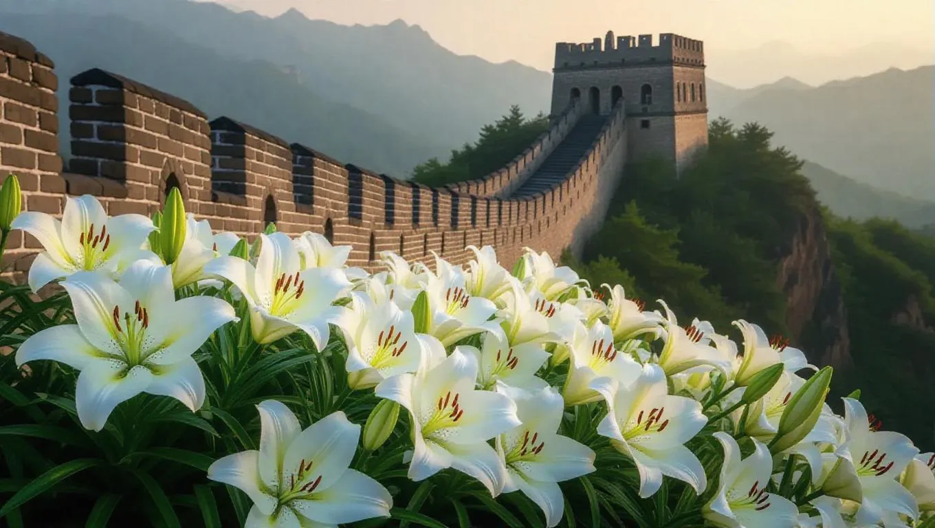An artistic close-up of the Great Wall of China, its ancient stones transformed into a mass of gentle cream lilies. The iconic wall shape remains, but the summit is now a tranquil, floral refuge. Dappled sunlight gently illuminates the blooms, casting a soft, inviting glow. The atmosphere is serene and contemplative, with muted clouds enhancing the tranquil, symbolic blend of nature and peace.
