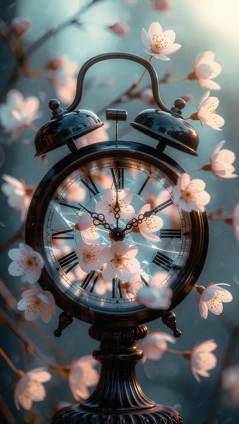 An antique clock, its glass shattered, with delicate petals floating out, time frozen in eternal bloom, surrounded by a soft, ethereal glow, capturing the moment of timeless beauty and fragility
