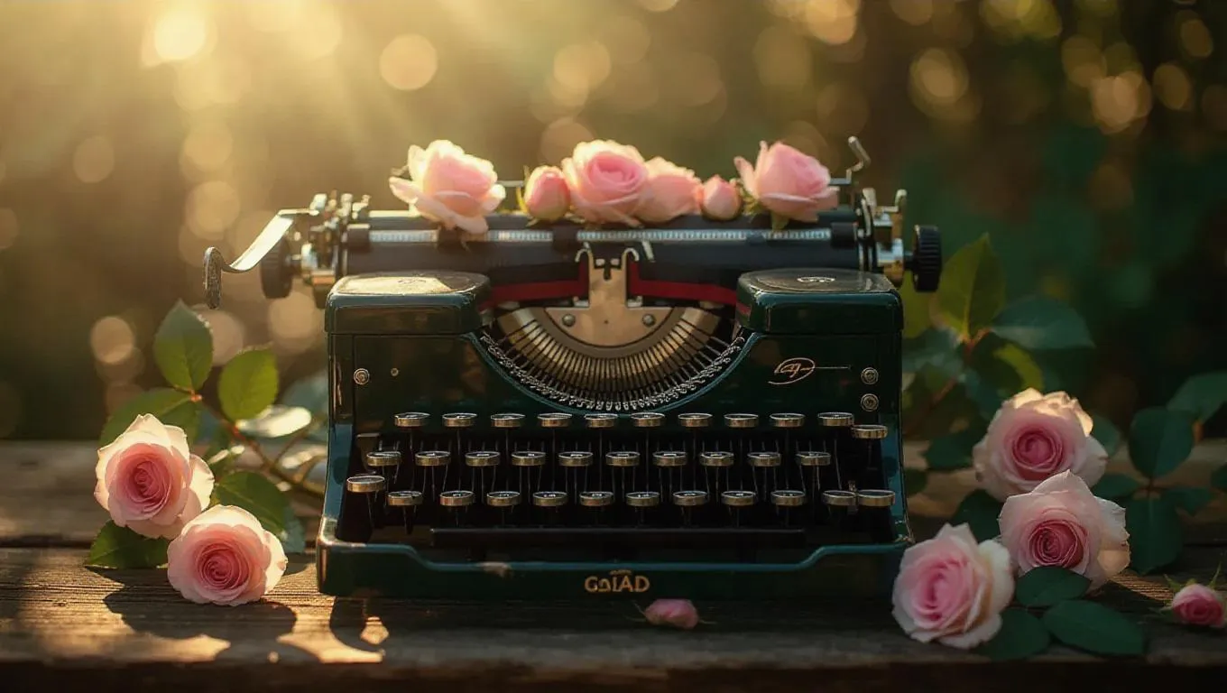 An antique typewriter with delicate, tiny roses blossoming from the keys and carriage, creating a whimsical blend of vintage charm and natural beauty. The typewriter rests on a rustic wooden surface, surrounded by soft, diffused sunlight filtering through leaves, enhancing the serene and magical atmosphere.