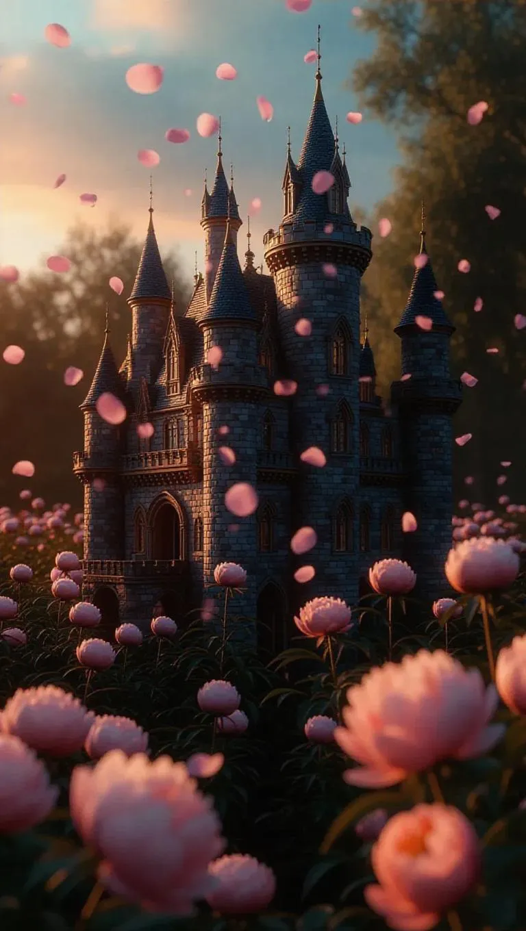 An ancient castle, its glass shattered, with delicate peony petals floating out, time frozen in eternal bloom, surrounded by a soft, ethereal glow, capturing the moment of timeless beauty and fragility in a fragrant peony garden.