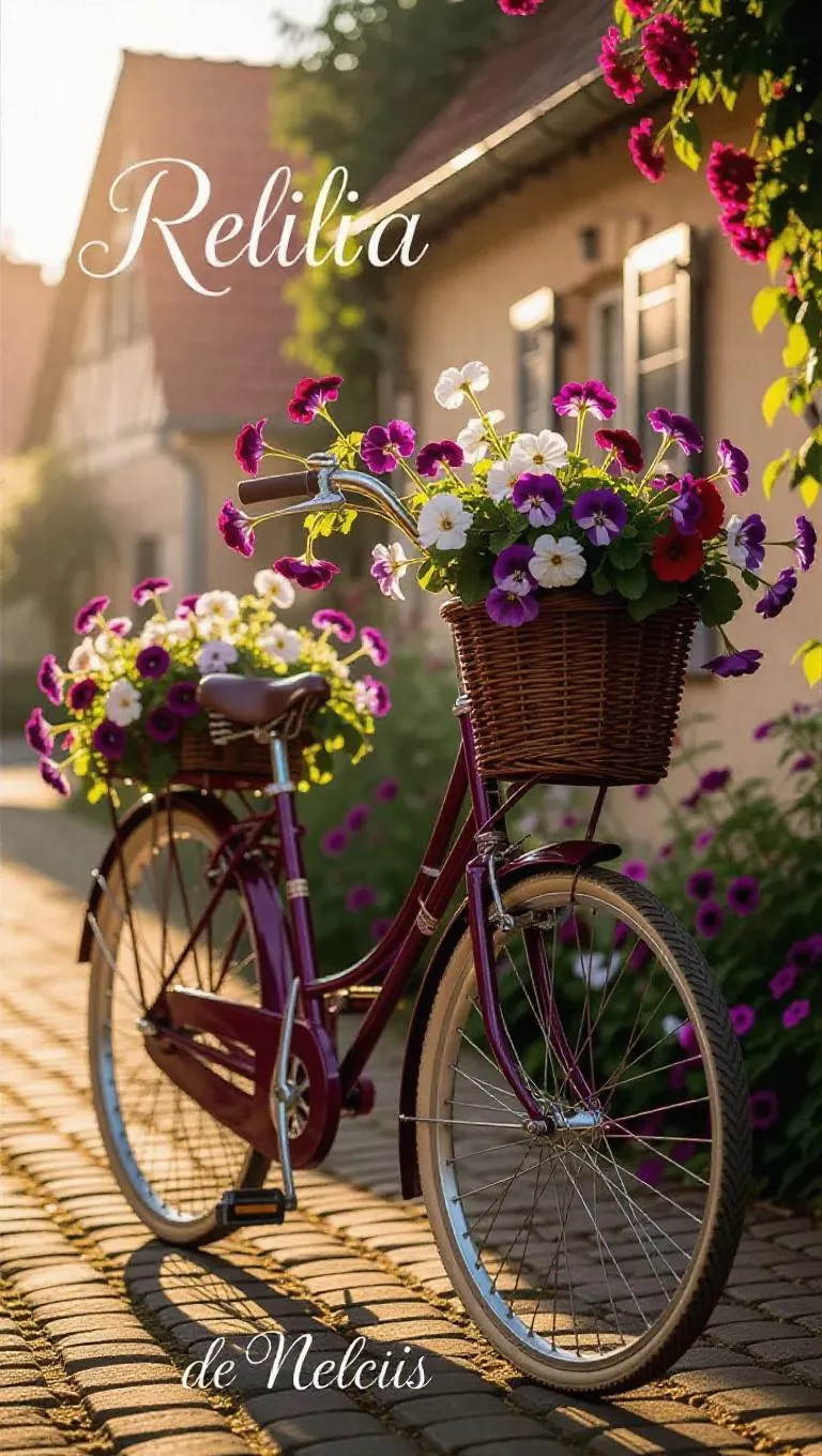 A lovely retro bicycle draped with violets and geraniums that seem to be gently touched by the breath of spring. The bicycle’s frame is gracefully designed, with a wicker basket at the back filled with fresh, colorful flowers in shades of purple, red, and white. The wheels shine in the late afternoon sun, reflecting the gentle beauty around. The flowers intertwine nicely from the handlebars and frame, creating a whimsical and serene atmosphere. The scene is set against a soft, blurred background of a quaint village, enhancing the focus on the bicycle and its floral frames. The entire composition exudes warmth and nostalgia, as if the bicycle is carrying a load of springtime dreams to a distant, enchanting destination. The art style is soft and detailed, capturing the delicacy of the flowers, the nostalgic charm of the bicycle, and the peaceful essence of the moment.