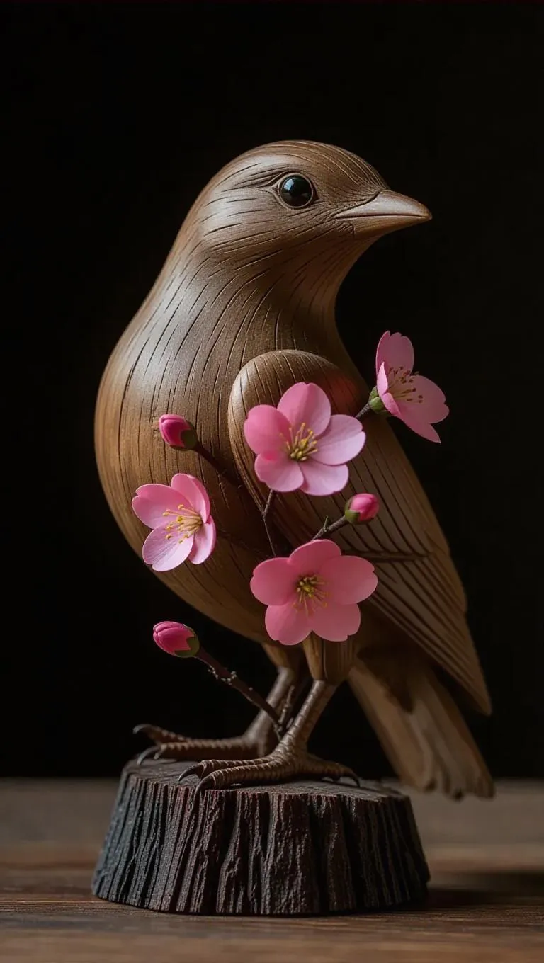 A melted wooden figurine shaped like a bird with pink flowers emerging from the cooled surface, symbolizing rebirth and renewal, the delicate petals contrasting with the hardened wood, creating a serene and poetic scene of life after destruction.