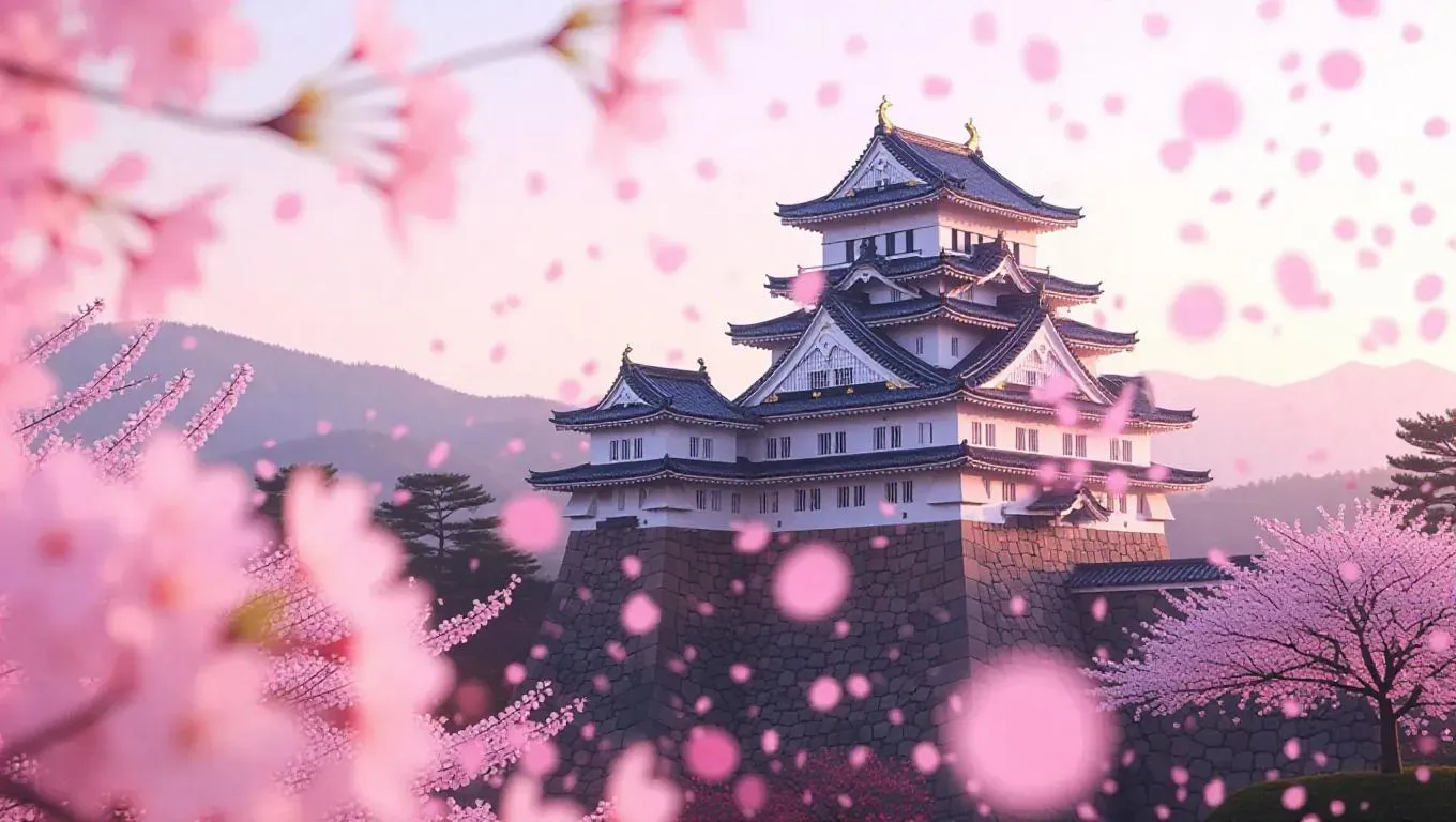 An ancient castle, its glass shattered, with delicate cherry blossom petals floating out, time frozen in eternal bloom, surrounded by a soft, ethereal glow, capturing the moment of timeless beauty and fragility in a fragrant cherry blossom garden.