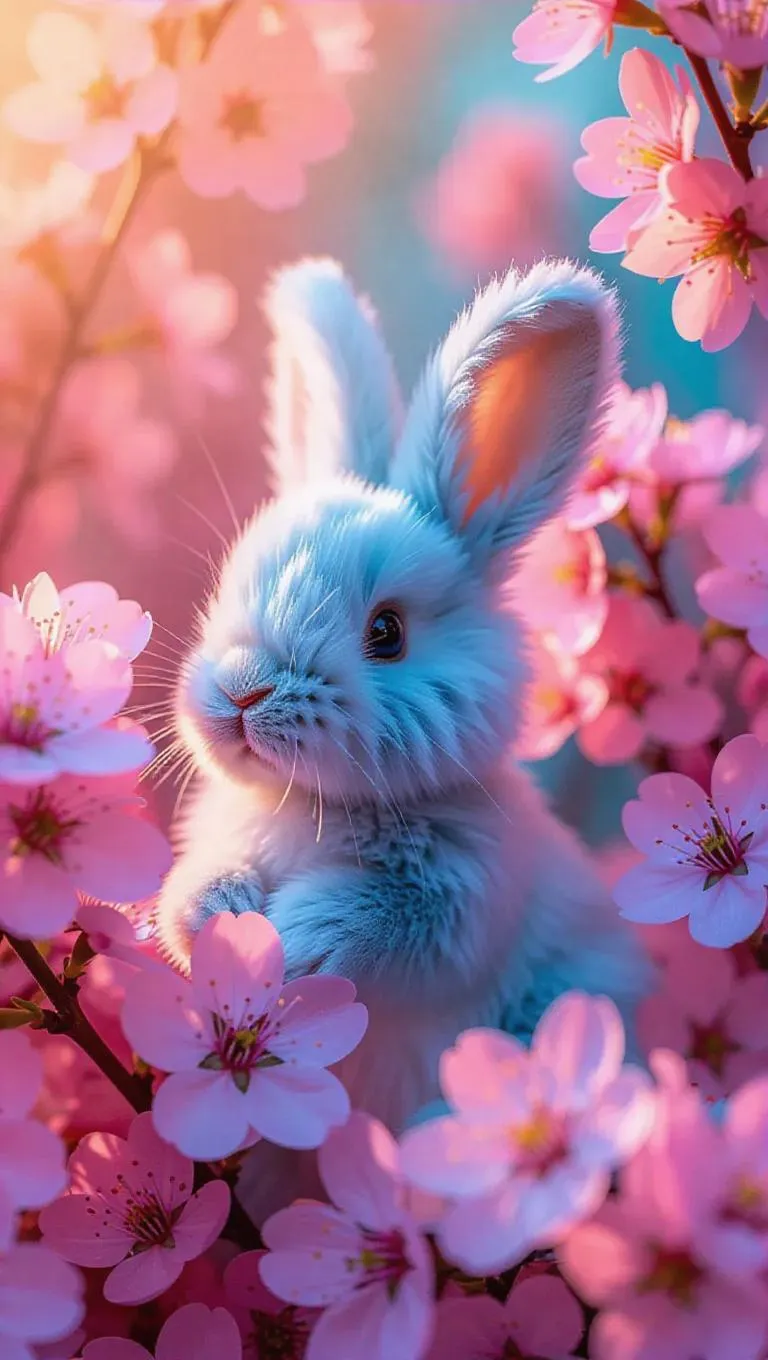 yellow cute blossoms delicately grow around a vividly colored plush bunny, creating a whimsical and enchanting scene. Soft petals surround the bunny, adding a touch of magic and fairy tale charm.