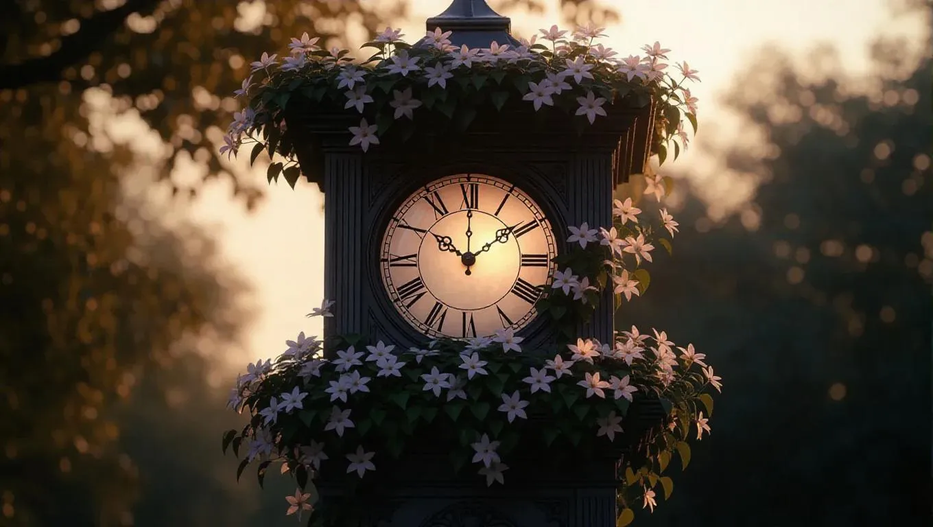 A beloved, aging clock tower, softly shining with a pearlescent glow from its broken face, entwined with creeping clematis that climbs its facade and blooms at its edges, creating a dreamy, enchanting atmosphere.