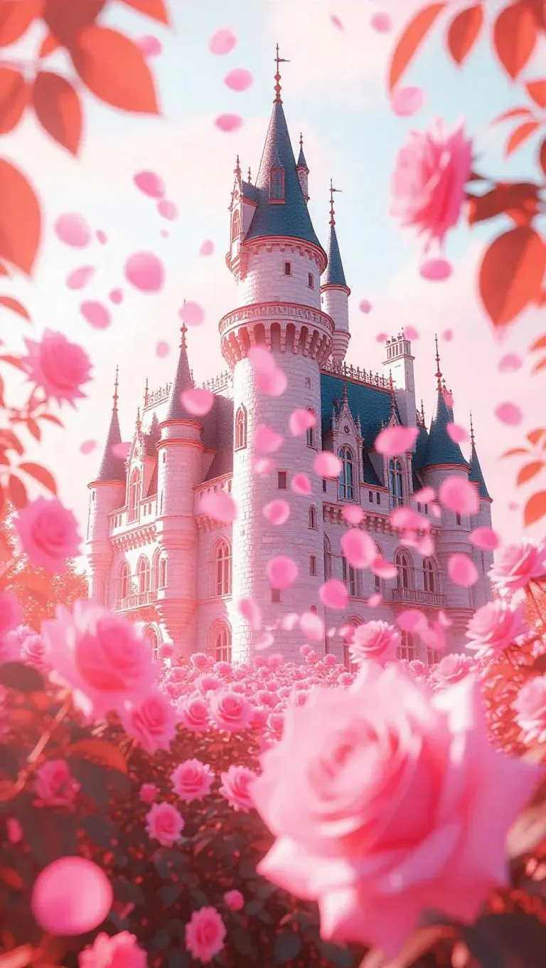An antique castle, its glass shattered, with vibrant rose petals floating out, time frozen in eternal bloom, surrounded by a soft, ethereal glow, capturing the moment of timeless beauty and fragility in a fragrant rose garden.