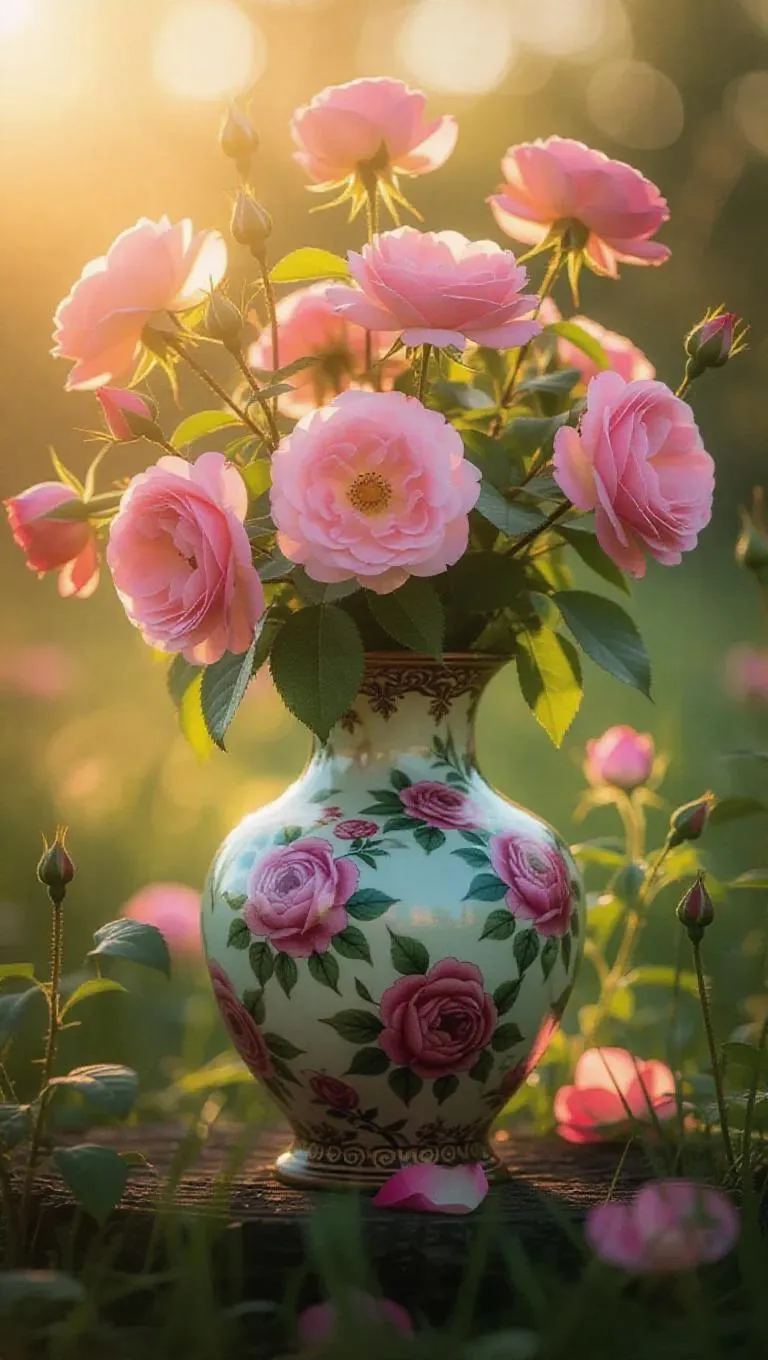 An antique vase, its ceramic cracked, with vibrant rose petals drifting out, time suspended in perpetual spring, surrounded by a gentle, luminous radiance, capturing the essence of everlasting beauty and delicacy in a lush meadow.
