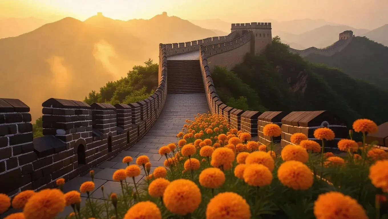 An artistic close-up of the Great Wall of China, its ancient stones transformed into a majestic expanse of golden marigolds. The iconic wall shape remains, but the summit is now a radiant, floral showcase. Bright morning sunlight gently illuminates the flowers, casting an uplifting, joyous glow. The atmosphere is serene and bountiful, with wispy clouds enhancing the tranquil, symbolic blend of nature and prosperity.