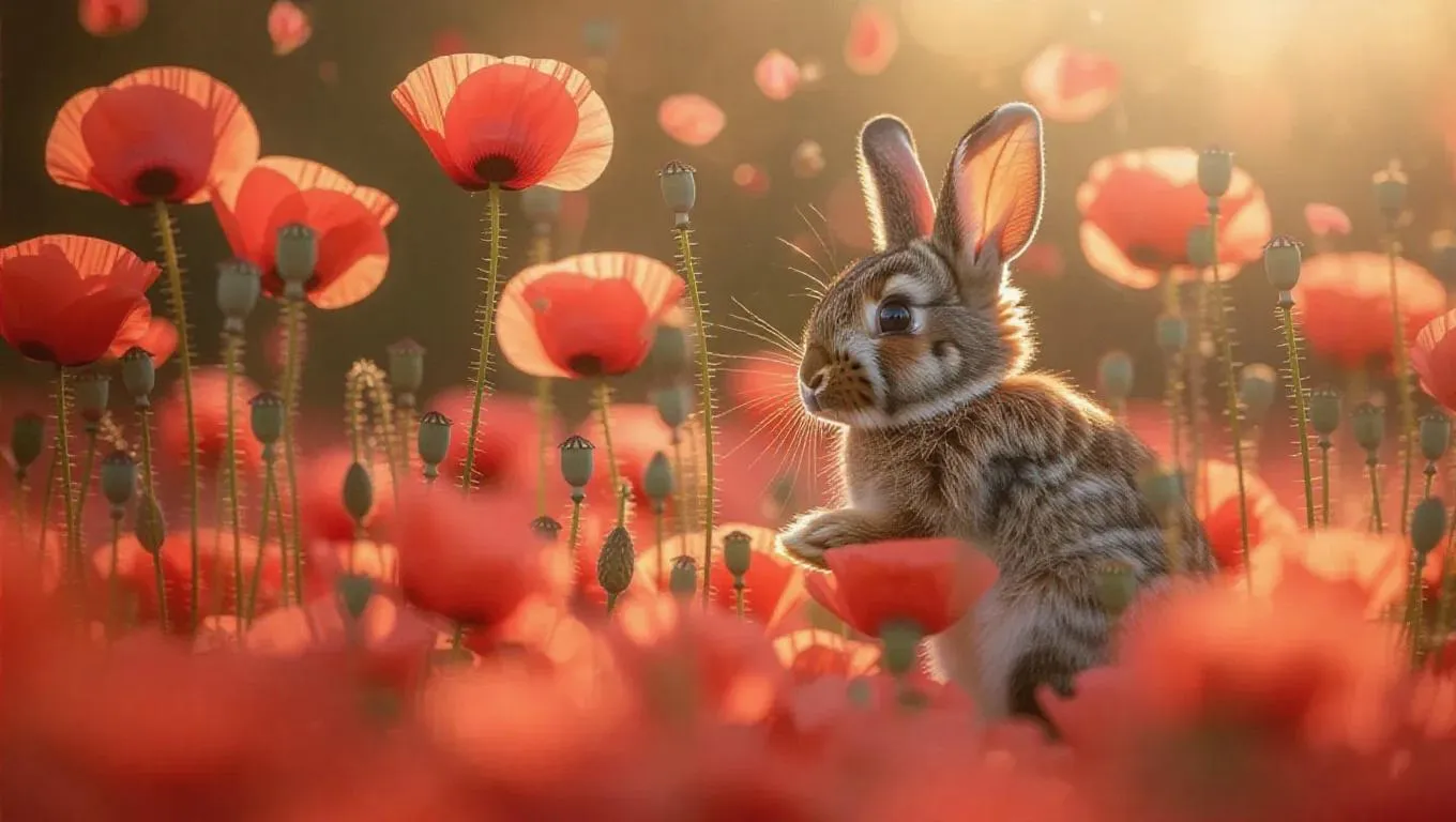 bright poppies gently dance around a fully detailed plush bunny, creating a whimsical and enchanting scene. Soft petals surround the bunny, adding a touch of magic and fairy tale charm.