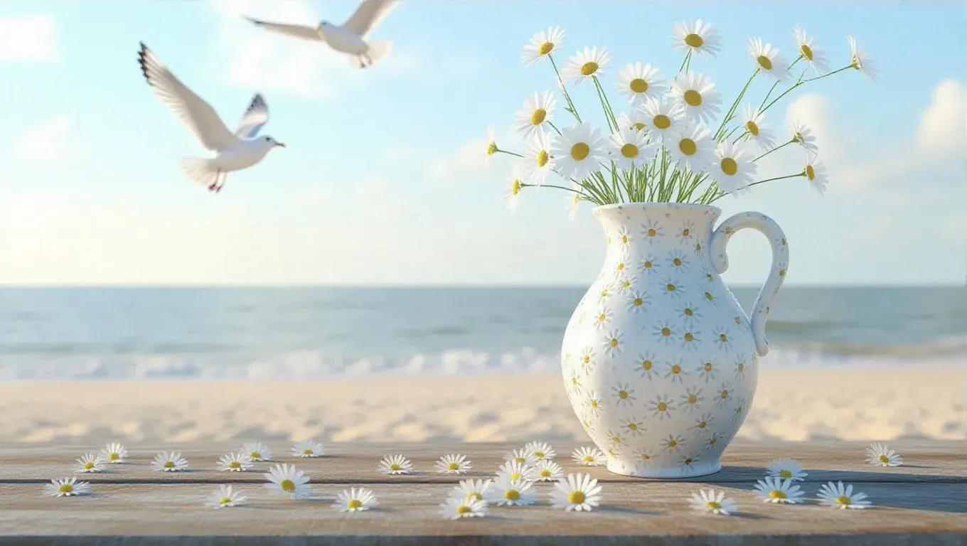 A cracked porcelain vase adorned with tiny daisies sprouting from its rim and handle, gently resting on a weathered wooden table by the beach, as a few seagulls soar overhead.