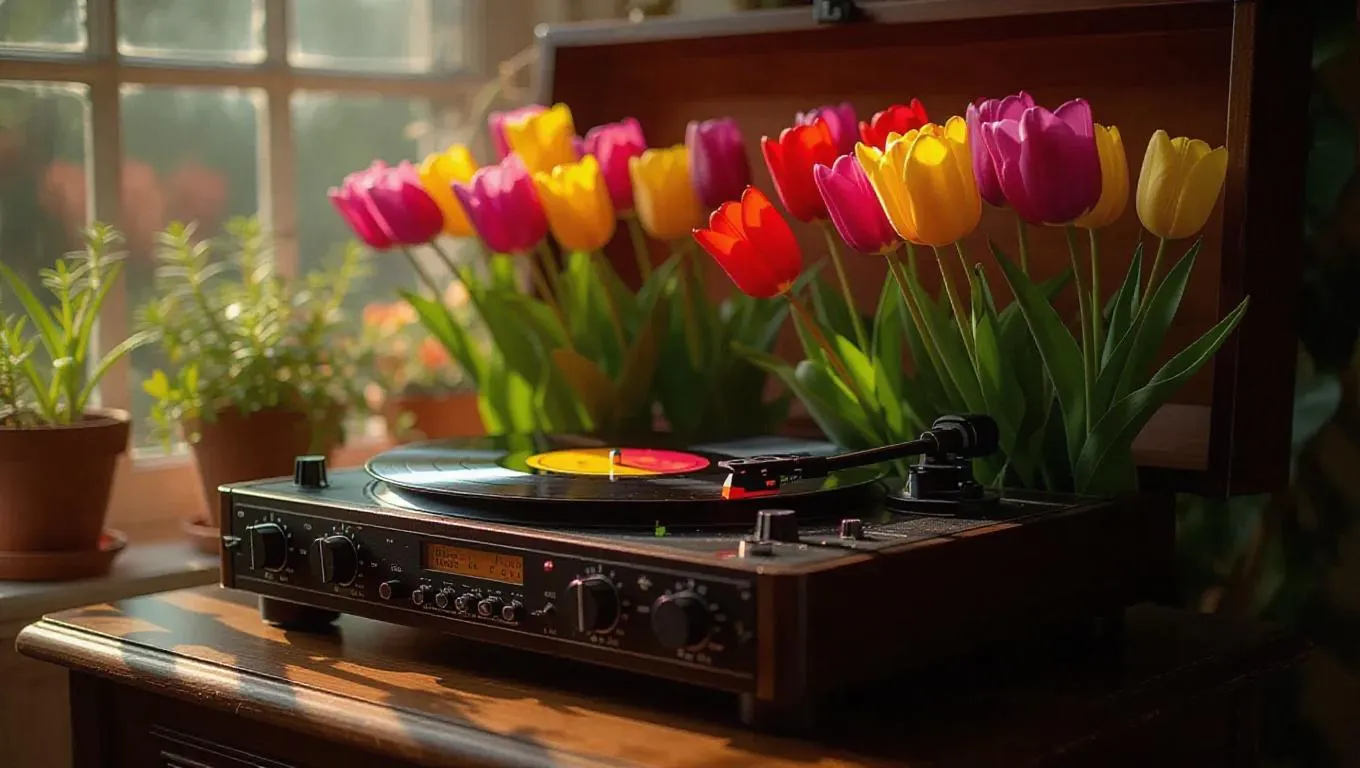 An antique vinyl record player adorned with colorful tulips sprouting from its speakers, playing joyous music in a well-lit room, casting an energetic, lively glow
