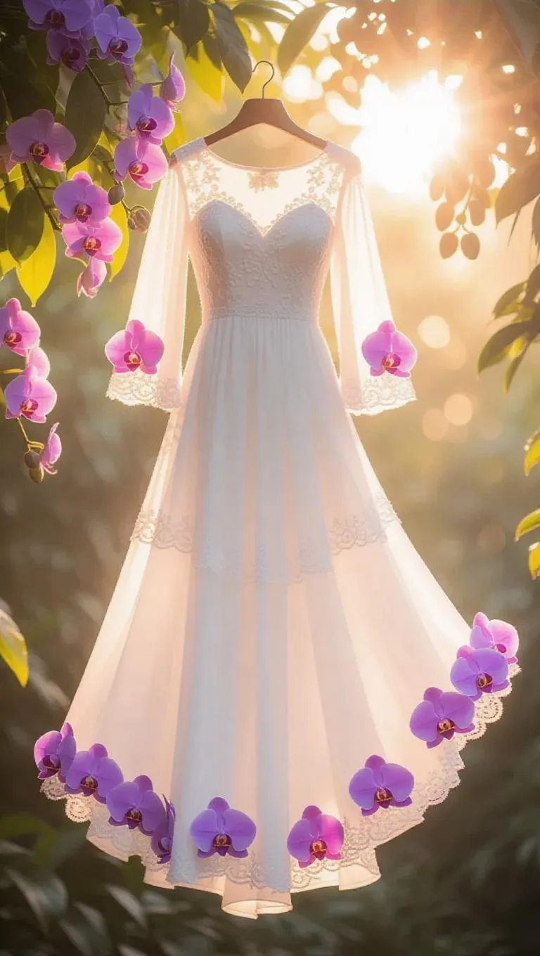 A flowing white dress with delicate purple orchids blossoming along the hem and sleeves, creating a whimsical blend of elegance and natural beauty. The dress sways gently in the breeze, surrounded by soft, tranquil sunlight filtering through leaves, enhancing the serene and magical atmosphere.