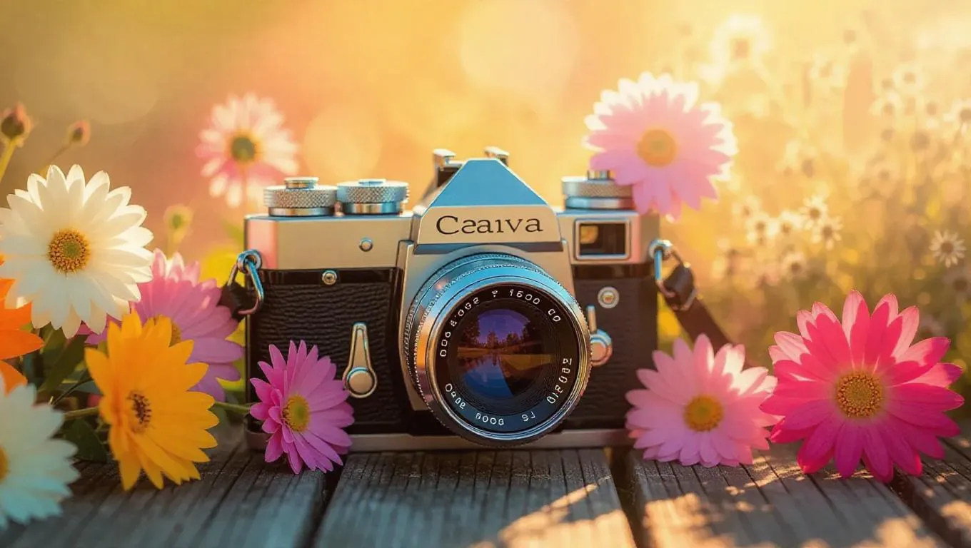 An antique camera with vibrant floral arrangements surrounding the lens and shutter buttons, creating a whimsical blend of vintage charm and colorful beauty. The camera rests on a rustic wooden surface, surrounded by soft, diffused sunlight filtering through blooms, enhancing the serene and magical atmosphere.