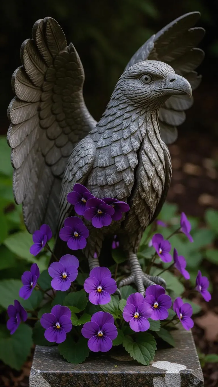 A stone statue of a bird, cracks along its wings opening into clusters of violets