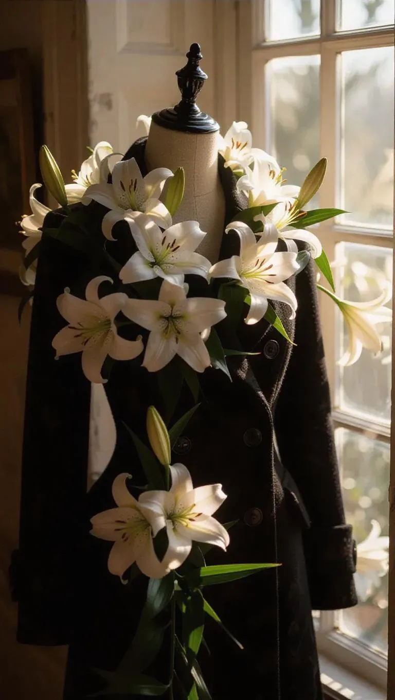 A fashionable coat embellished with intricate lilies wrapping around the collar, merging a stylish edge with floral elegance. The coat is displayed on a mannequin, illuminated by soft, dappled sunlight peeking through window panes, heightening the tranquil and magical setting.