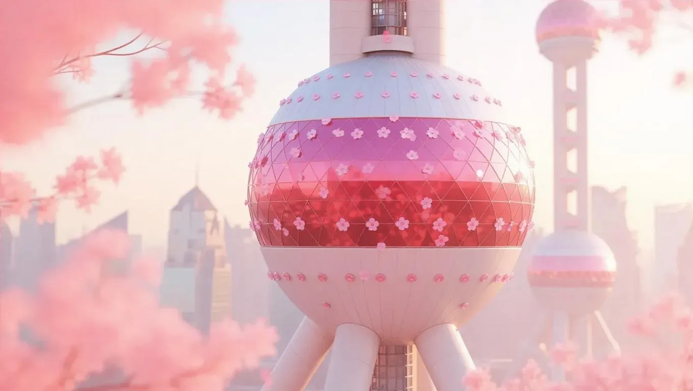 A close-up of the Shanghai Oriental Pearl Tower transformed into a soft, plush, and whimsical version of itself, covered in delicate coral blossoms. The iconic spheres and structure of the tower are rendered in a fluffy, tactile texture, giving it a charming and playful appearance. The tiny coral flowers bloom abundantly across its surface, creating a romantic and dreamy atmosphere. The background is softly blurred, with hints of a summer fair and gentle sunlight enhancing the warmth and serenity of the scene. The overall composition exudes a sense of fantasy and enchantment, blending the modern landmark with the softness of nature. The art style is highly detailed and imaginative, emphasizing the fluffy texture of the tower and the delicate beauty of the flowers.