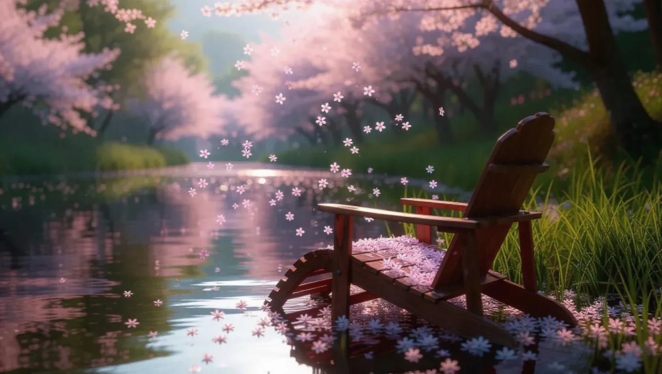A chair lying in a peaceful riverside clearing, its wooden body cracked open, with many cherry blossoms sprouting from within, petals fluttering in the breeze, creating a surreal and enchanting scene.