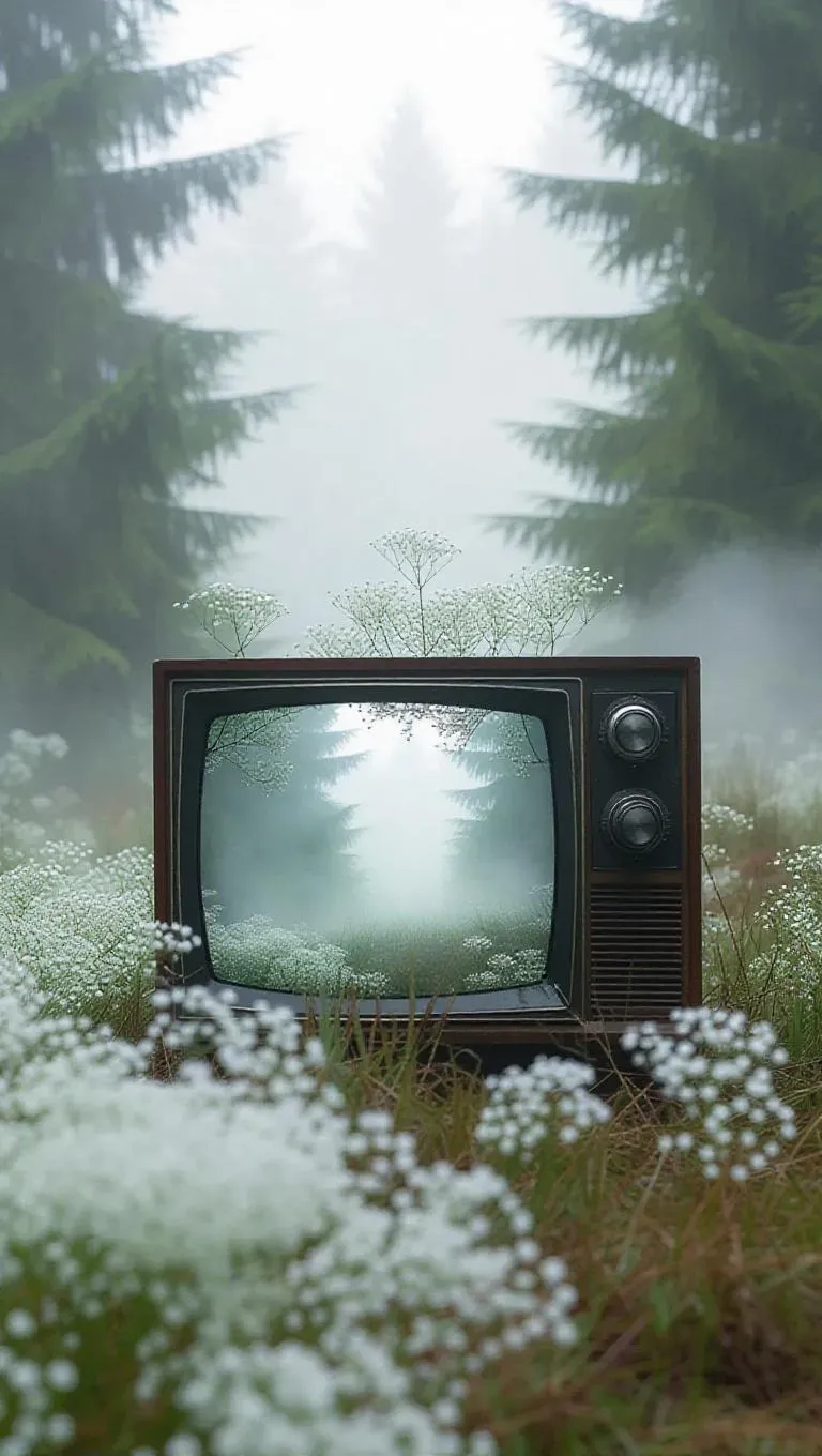 A broken television set nestled in a foggy fairest, its screen glowing faintly, blooming with tiny white baby's breath flowers, surrounded by enchanted trees and swirling mist