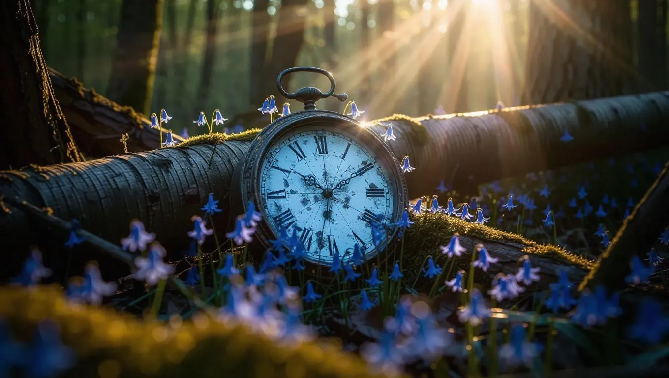 A fractured clock lying amidst the wild thicket, its digits shining faintly, blooming with bluebells, framed by bark-covered logs and scattered beams of sunlight cascading through the foliage.