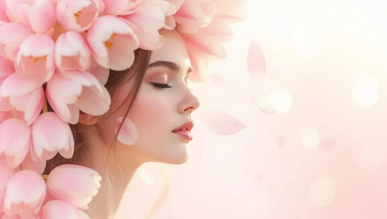 A serene portrait of a woman crafted from delicate petals, enveloped in a radiant halo of blush and soft tulips, set against a dreamy, isolated backdrop with ethereal light, enhancing the mystical and enchanting