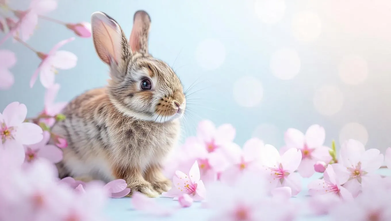 Pink cute blossoms delicately grow around a playful toy rabbit, creating a whimsical and enchanting scene. Soft petals surround the rabbit, adding a touch of magic and fairy tale charm.