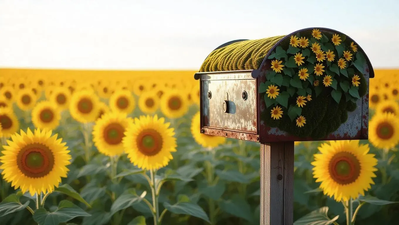 A moss-covered mailbox situated in a sunflower field, with bright yellow petals swaying gently in the breeze, creating a warm and sunny atmosphere