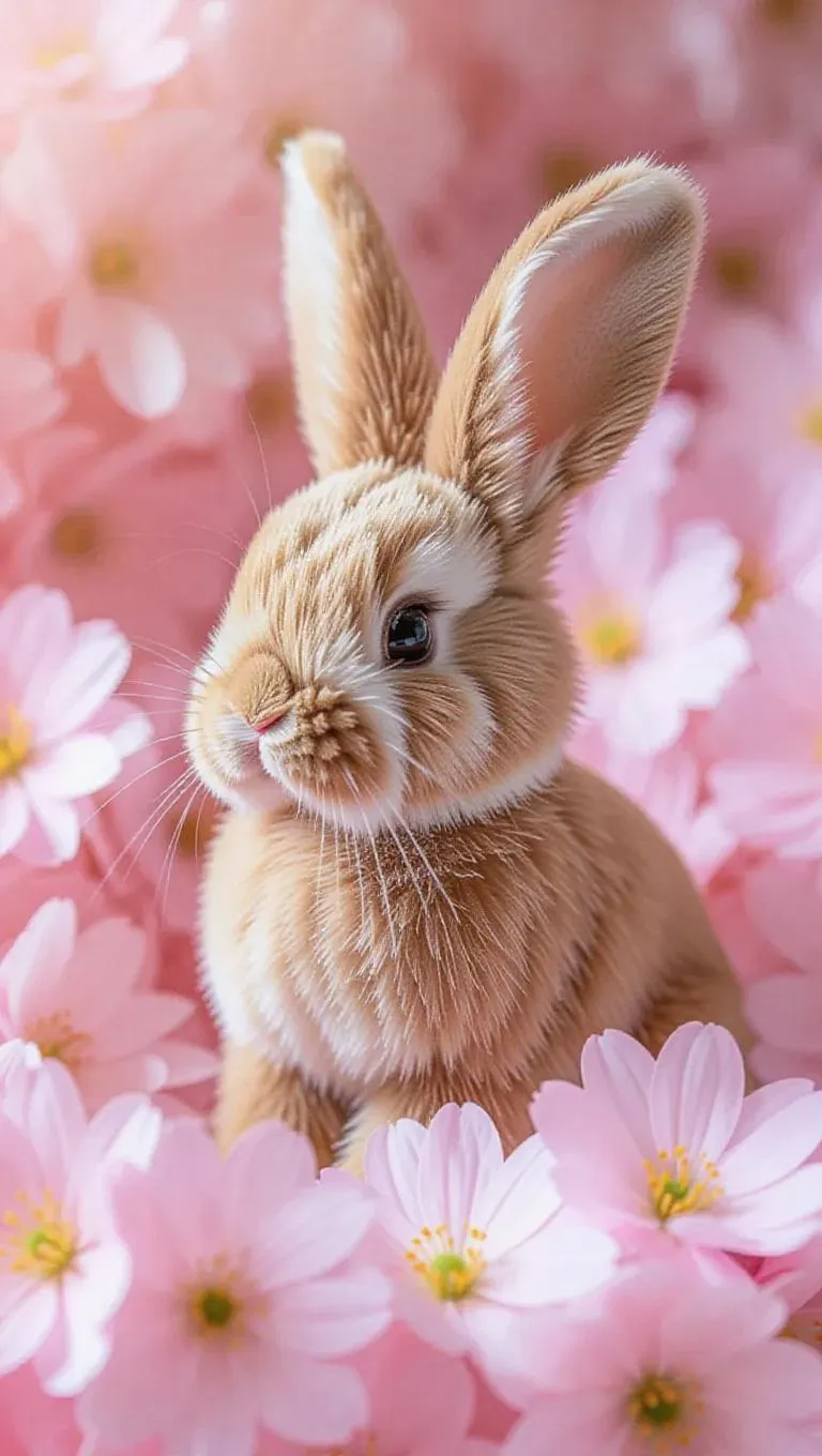 golden petals softly drift around a fully detailed plush bunny, creating a whimsical and enchanting scene. Soft petals surround the bunny, adding a touch of magic and fairy tale charm.