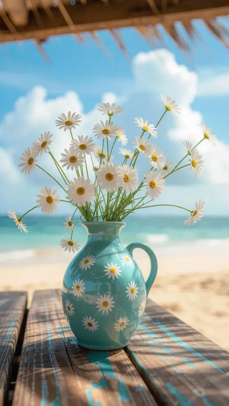 A cracked porcelain vase adorned with tiny daisies sprouting from its rim and handle, gently resting on a weathered wooden table by the beach, under a canopy of shifting clouds.