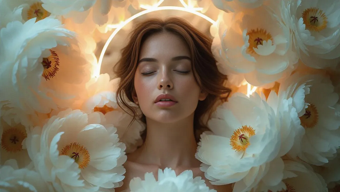 A serene portrait of a woman crafted from delicate petals, enveloped in a radiant halo of creamy white and soft peonies, set against a dreamy, whimsical backdrop with ethereal light, enhancing the mystical and enchanting